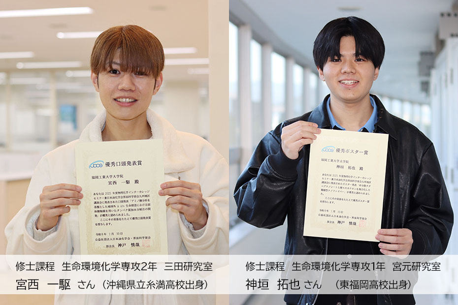 - 2026.03.27 トピックス [大学院 生命環境化学専攻]三田研究室 ・宮元研究室『2025年度 物理化学インターカレッジセミナー兼 日本油化学会 界面科学部会 九州地区講演会』にて優秀口頭発表賞・優秀ポスター賞を受賞